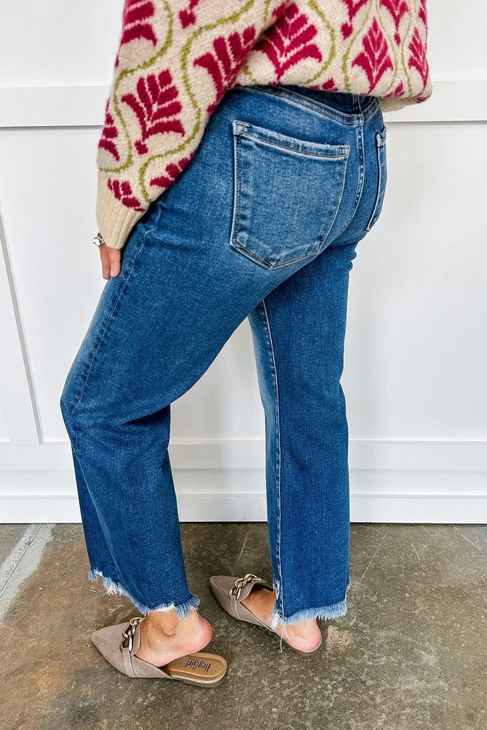 💫 Designed with Risen’s built-in tummy control for that cinched-in feel, this high-rise pair hits at the ankle with a frayed hem. Classic 5-pocket styling and zip fly closure.