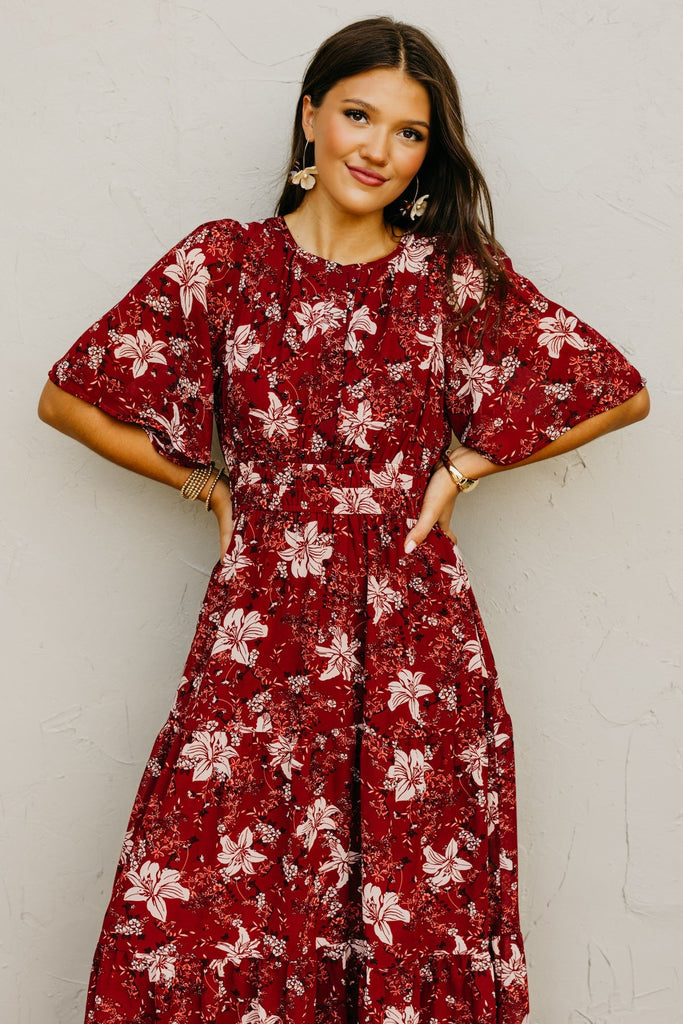 A brown background with a floral print throughout in hues of ivory, tan, charcoal, and brown