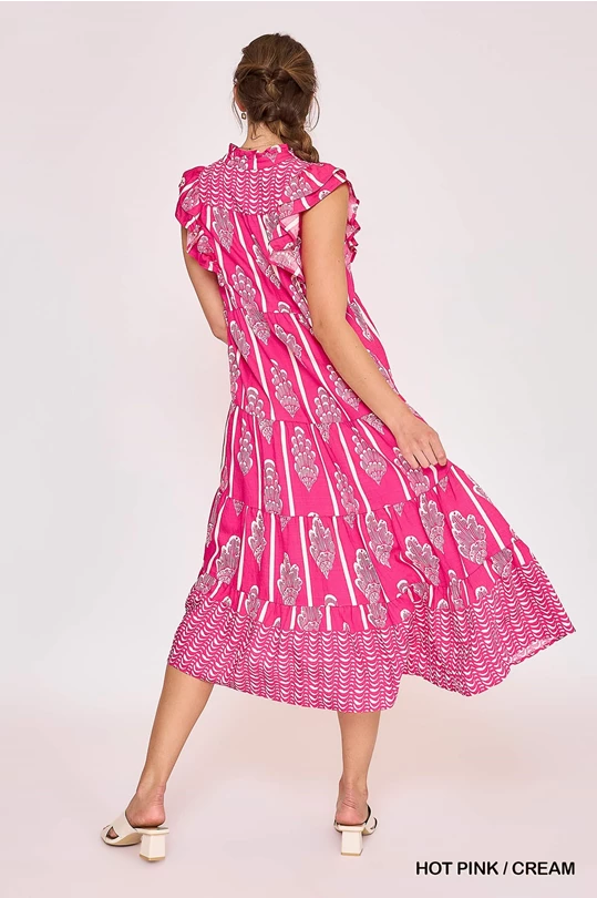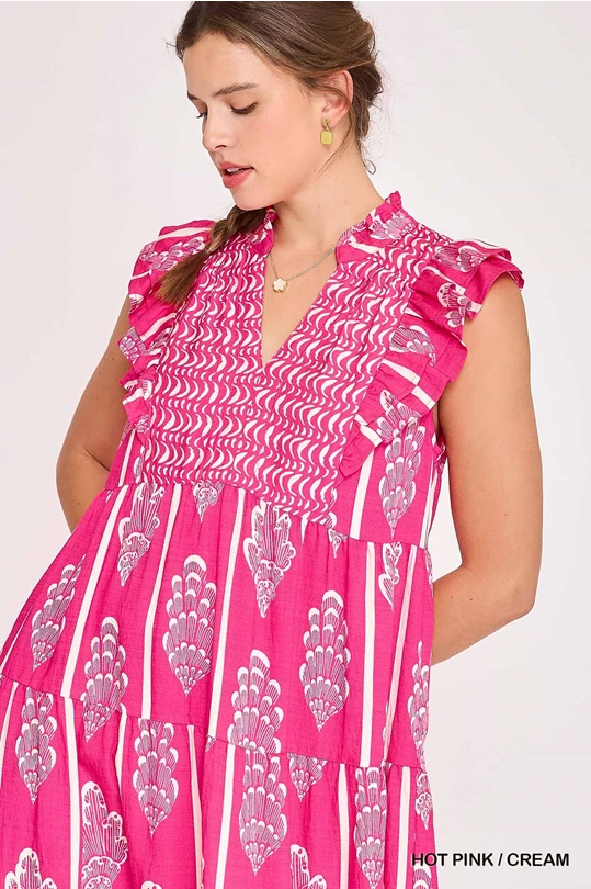 UMGEE Border Print Smocked Maxi Dress Pink Mix