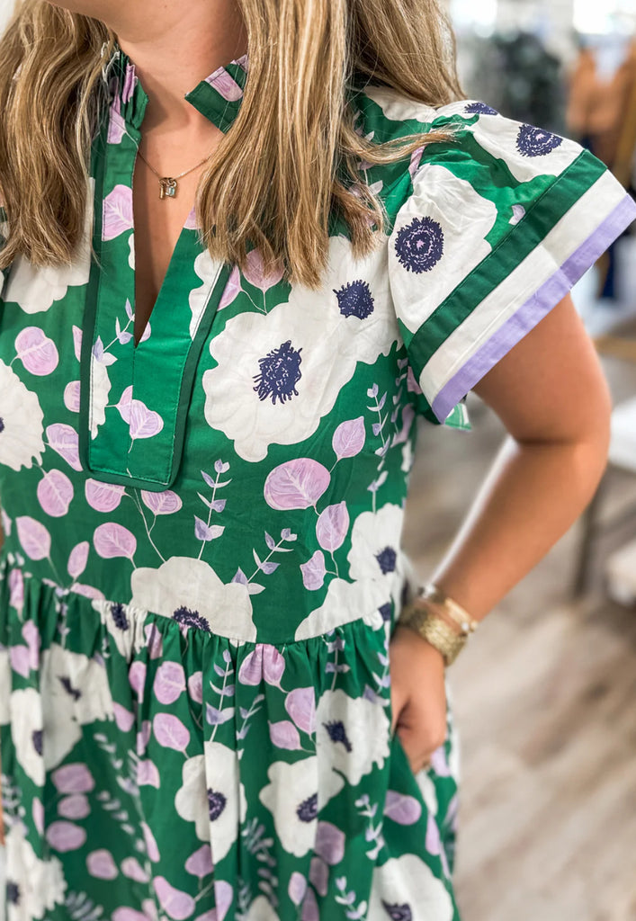 Floral print flutter ruffle sleeve tiered pullover midi dress featuring multicolor band detail. Side pockets. Lined. Woven. Non-sheer. Lightweight.