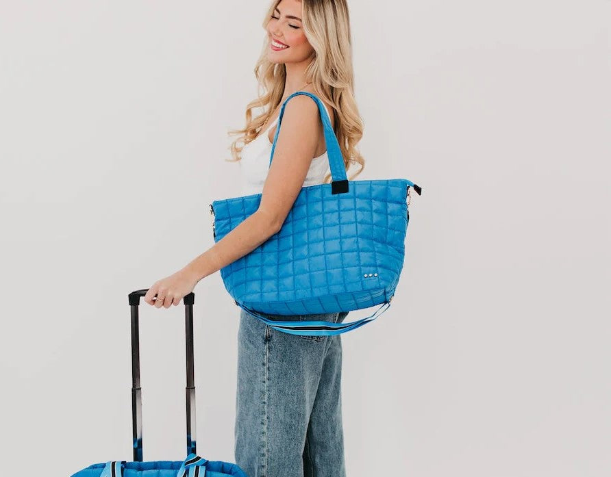 Day Dreamer Quilted Tote Bag is the bag you never knew you needed. Functional as an everyday and everything catch all, you will love the organization pockets and function of this tote. Our favorite part is the outside back pocket that converts to a trolley sleeve to make travel a breeze. The accented color straps add a pop of interest to your newest addition.