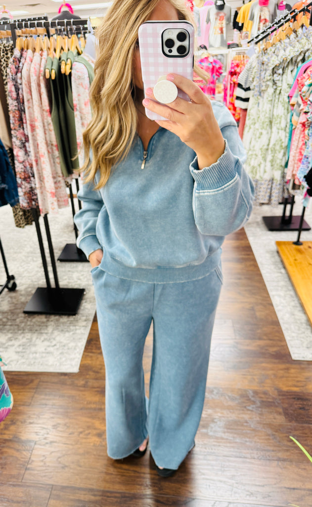 Lounge or run your errands in comfort AND style with these unique washed french terry pants! (Perfect for travel days too!) Keep it cool with the acid wash finish while the high rise waist provides a flattering look. The elastic waist features a functional drawstring tie for the perfect fit while side pockets add convenience. Additionally styled with raw edge details and a wide leg for a trendy finish.