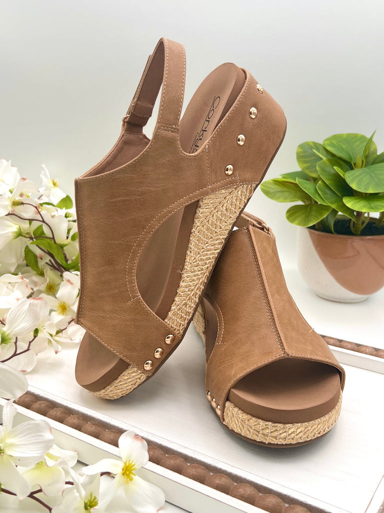 If you're familiar with the Carley style, The Volta II sandal has the same wonderful features just with a shorter heel! The Volta II sandal by Corkys Footwear features a faux leather upper, a hook and loop closure, an open toe, a unique raffia design cork wedge, and lots of smoosh! The insole is a soft and flexible material that conforms to your foot and provides cushioning and support. The cork wedge adds some height and elegance, while the open toe lets your toes breathe.