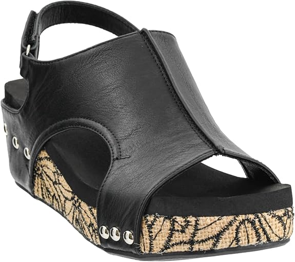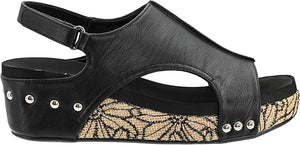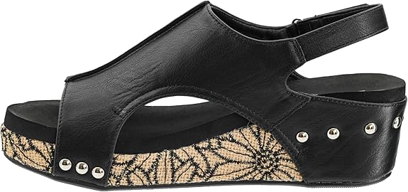 If you're familiar with the Carley style, The Volta II sandal has the same wonderful features just with a shorter heel! The Volta II sandal by Corkys Footwear features a faux leather upper, a hook and loop closure, an open toe, a unique floral design cork wedge, and lots of smoosh! The insole is a soft and flexible material that conforms to your foot and provides cushioning and support. The cork wedge adds some height and elegance, while the open toe lets your toes breathe.