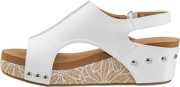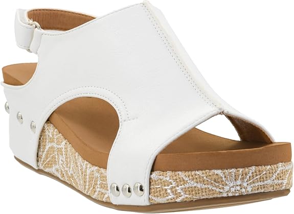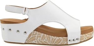 If you're familiar with the Carley style, The Volta II sandal has the same wonderful features just with a shorter heel! The Volta II sandal by Corkys Footwear features a faux leather upper, a hook and loop closure, an open toe, a unique floral design cork wedge, and lots of smoosh! The insole is a soft and flexible material that conforms to your foot and provides cushioning and support. The cork wedge adds some height and elegance, while the open toe lets your toes breathe.