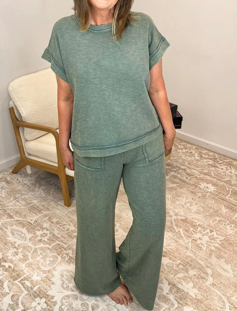 Ribbed design, round neckline, cap sleeves, elastic waistband.